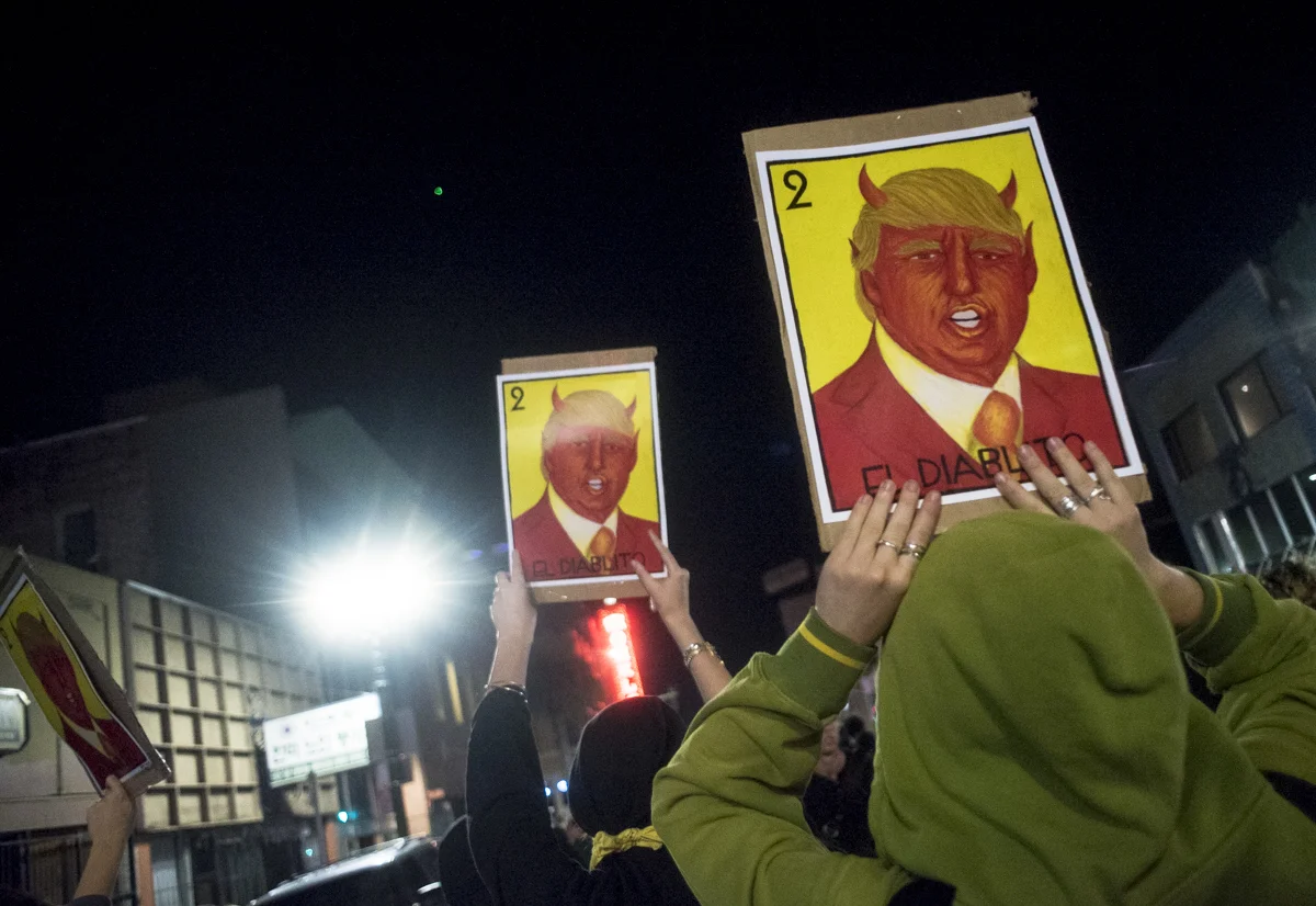 Protesters hold up signs reading "El Diablito" (the little devil) during an anti-Trump protest in downtown Oakland on November 10, 2016.