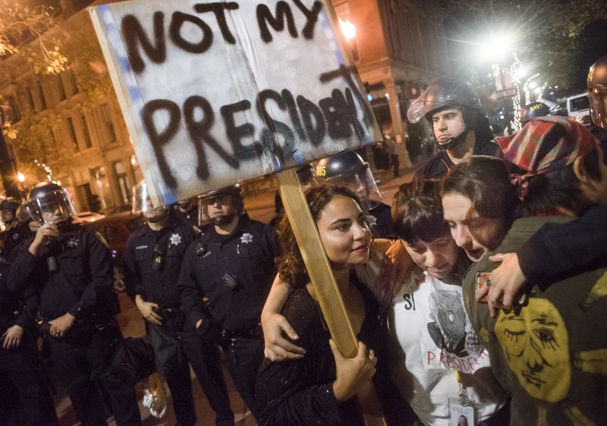 Destinee Yarrow holds up a sign reading "Pussy grabs back!" to Oakland riot police during an anti-Trump protest in downtown Oakland on November 9, 2016.