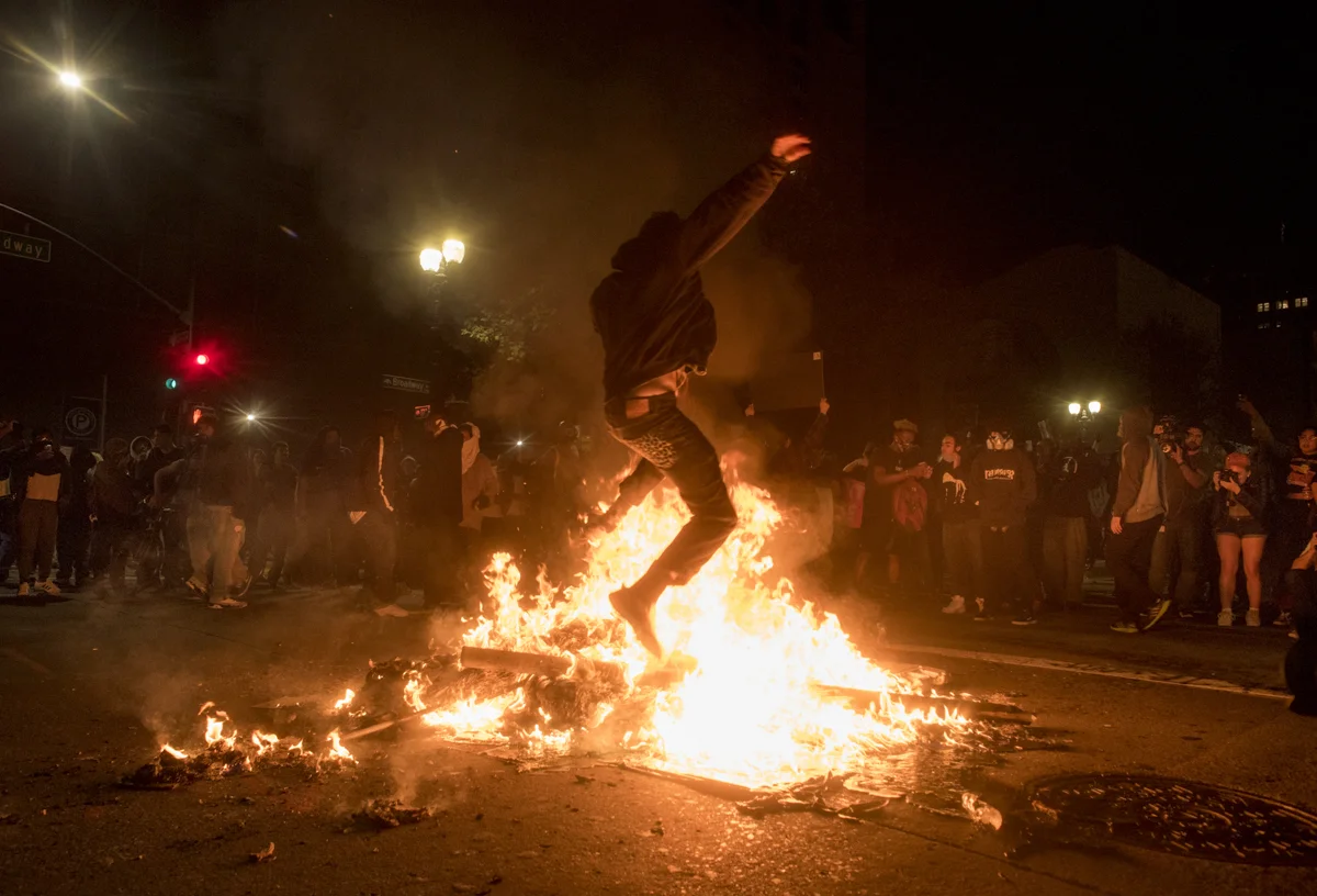Protesters burned trash cans and spray painted building facades of downtown Oakland late into the night in protest of President-elect Donald Trump on November 9, 2016.