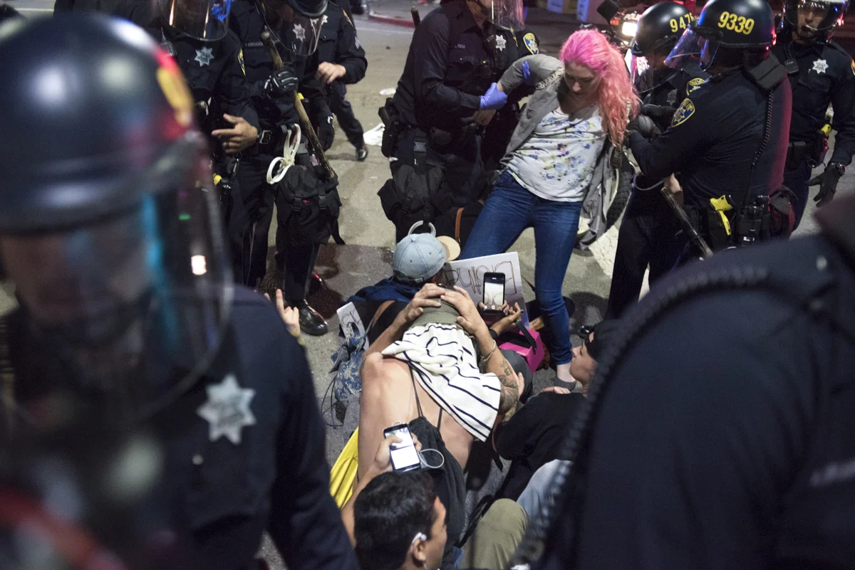 Protesters are arrested by Oakland Police Department riot police in the late hours of an anti-Trump protest that filled the streets of downtown Oakland on November 9, 2016.