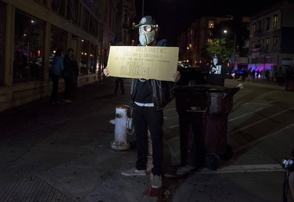 Nicholas Large of Clayton holds a sign at the row of Oakland Police Department riot police during an anti-Trump protest in downtown Oakland on November 9, 2016.