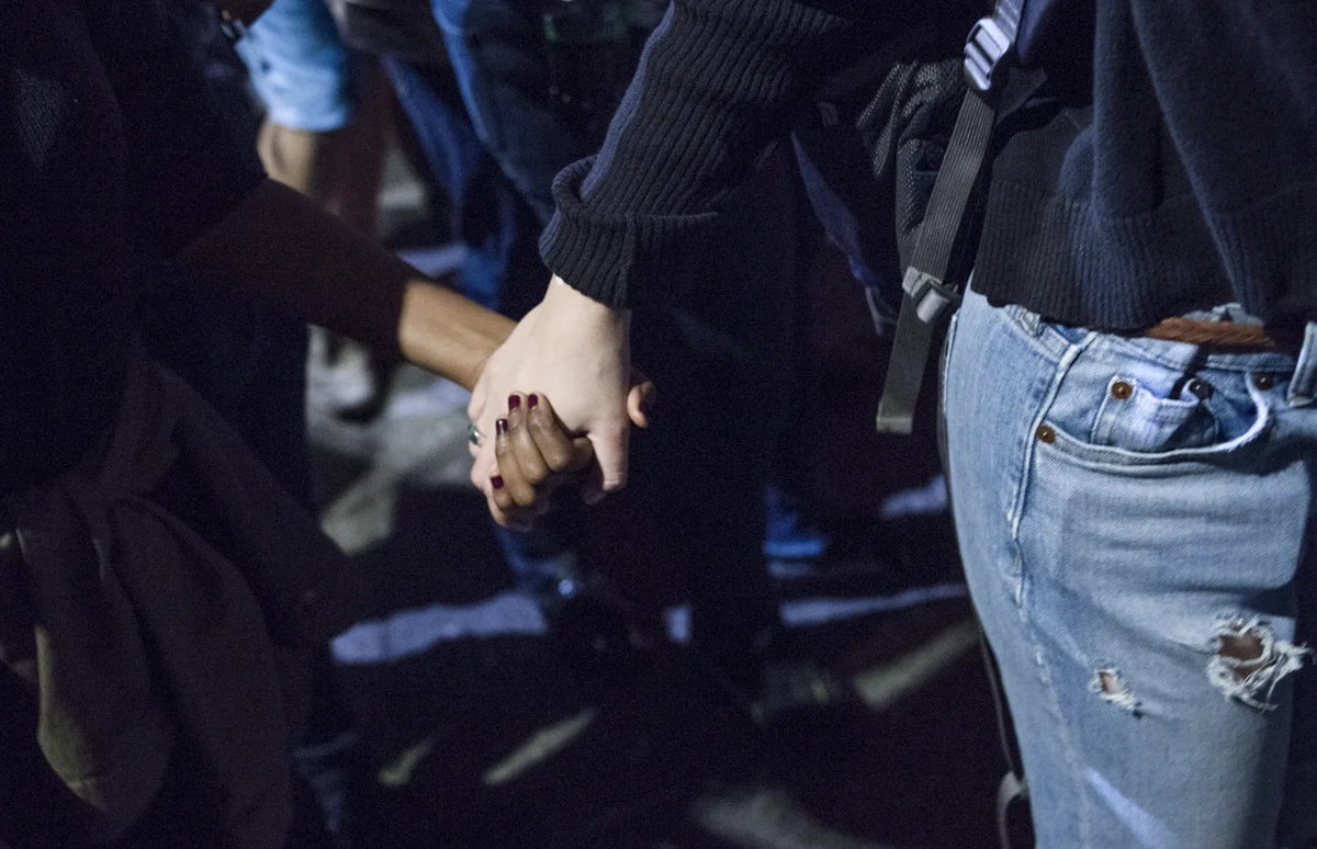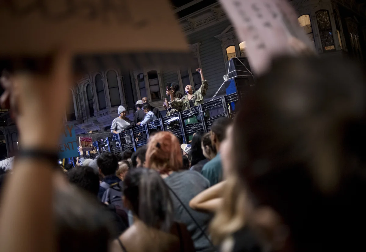 Kayla Corelovo and Kevin Garcia, middle, embrace during a chant at the anti-Trump protest in downtown Oakland on November 10, 2016.