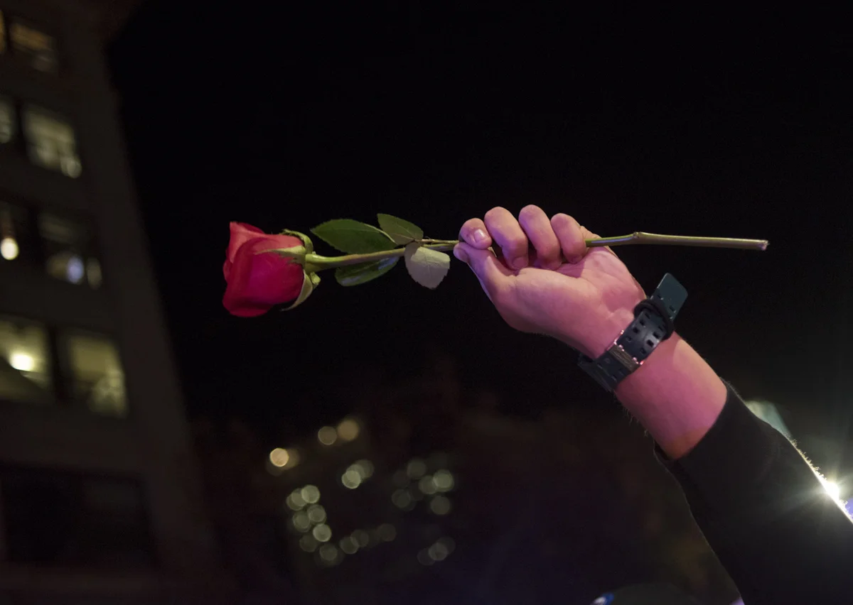 Protesters hold up signs of peace to Oakland Police Department riot police in the late hours of an anti-Trump protest that filled the streets of downtown Oakland on November 9, 2016.