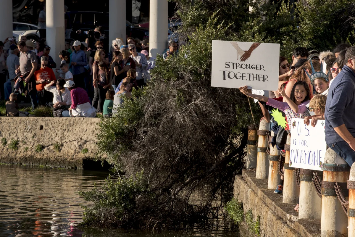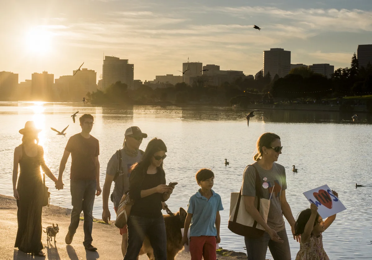 This evening, over 7,000 people gathered around Lake Merritt in Oakland to join hands in response to the election of Donald Trump. Music of different cultures and salsa dancing energized the crowd, a melting pot of people from all across the Bay Area that traveled to the city to join hands around the 3.4 mile circumference of the lake.